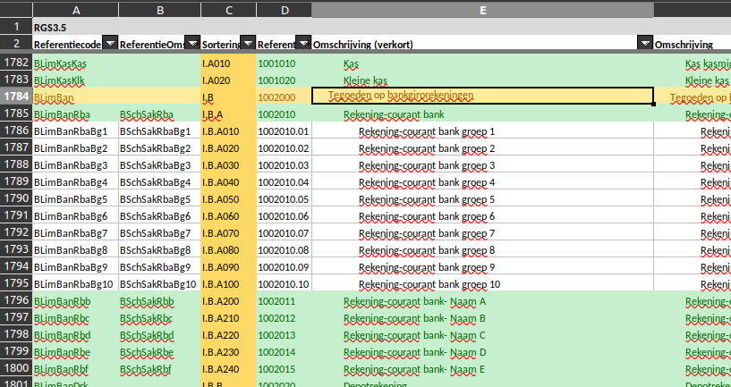 Dat is redelijk helder. Dus ik kan volgens mij bijv. een IBAN-rekeningnummer toevoegen aan “Rekening-courant bank groep 1” (waarvan ik de beschrijving sowieso mag aanpassen van de standaard) door het IBAN-nummer achter de referentiecode (“BLimBanRbaBg1”) te plakken, gescheiden door een punt: BLimBanRbaBg1.NL91INGB0007123456. Of, in het geval dat ik aan wil haken op het grootboek (i.p.v. “mutatie”)-niveau daarboven: BSchSakRba.NL91INGB0007123456.